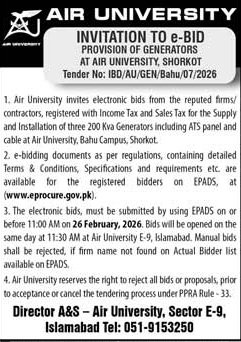 Air University Islamabad Pakistan has invited sealed bids from eligible firms, contractors, suppliers, and companies for the procurement of goods, services, or works as mentioned in this tender notice. This tender is issued in accordance with applicable procurement rules and is open to qualified bidders who meet the eligibility criteria.