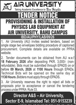 Air University Islamabad Pakistan has officially announced a public tender for the procurement of services / supply of goods / execution of development works. This tender is invited under the applicable PPRA rules and government procurement regulations.