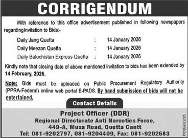 Anti Narcotics Force Quetta Pakistan has invited sealed bids from eligible firms, contractors, suppliers, and companies for the procurement of goods, services, or works as mentioned in this tender notice. This tender is issued in accordance with applicable procurement rules and is open to qualified bidders who meet the eligibility criteria.