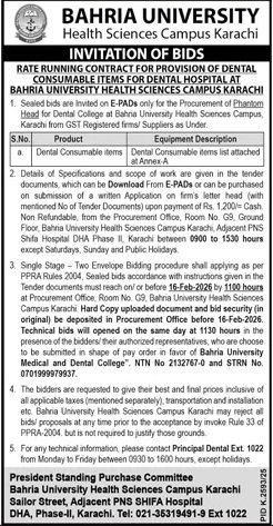 Bahria University Karachi Pakistan has invited sealed bids from eligible firms, contractors, suppliers, and companies for the procurement of goods, services, or works as mentioned in this tender notice. This tender is issued in accordance with applicable procurement rules and is open to qualified bidders who meet the eligibility criteria.
