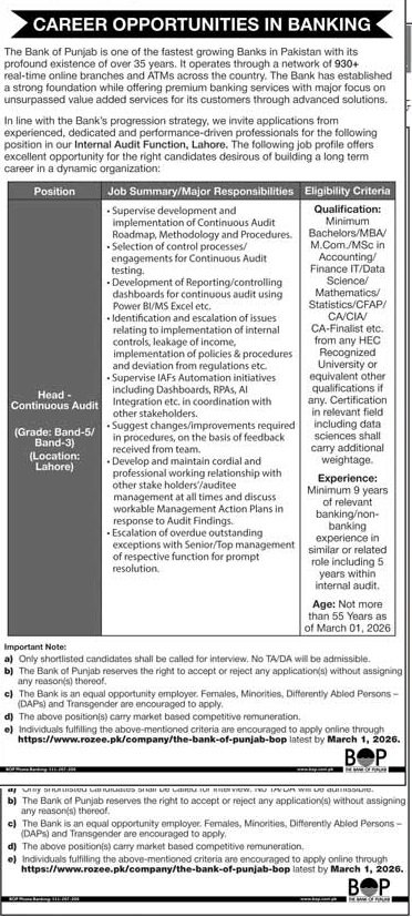 Bank Of Punjab Lahore Pakistan Jobs 2026 – Apply Online (Posted Date: 15, Feb)