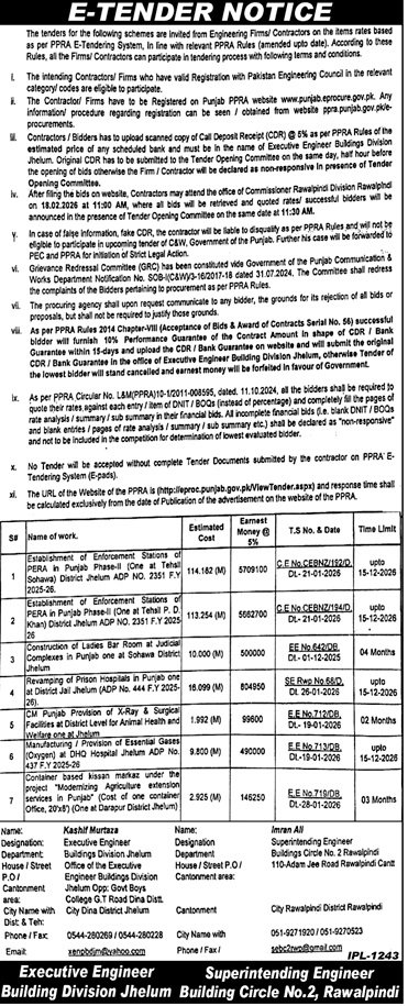 Buildings Department Rawalpindi Pakistan has invited sealed bids from eligible firms, contractors, suppliers, and companies for the procurement of goods, services, or works as mentioned in this tender notice. This tender is issued in accordance with applicable procurement rules and is open to qualified bidders who meet the eligibility criteria.