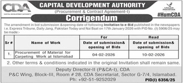 Capital Development Authority Islamabad Pakistan – Corrigendum dated 03, Feb 2026