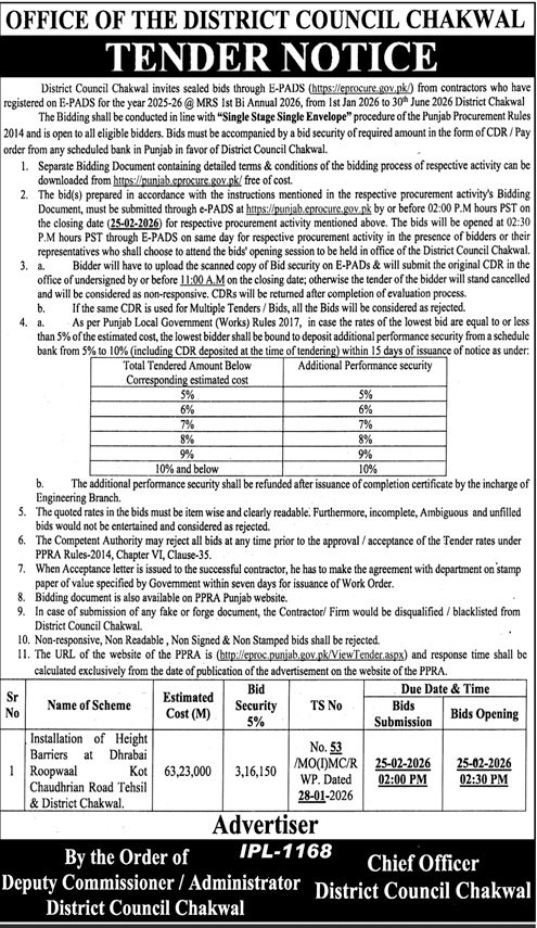 District Council Chakwal Pakistan – Tender dated 02, Feb 2026