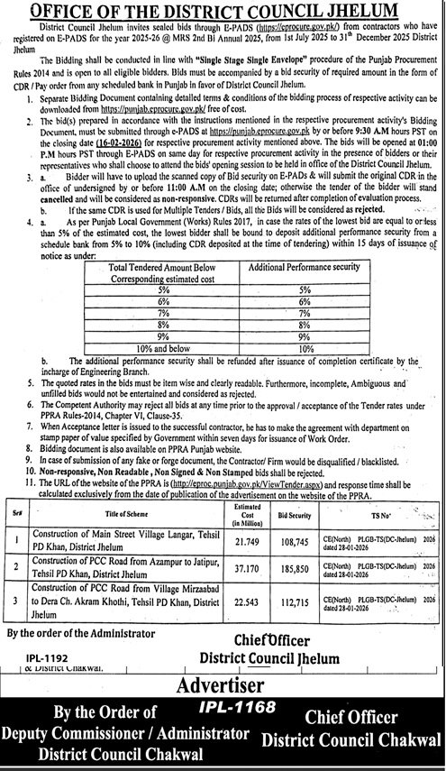 District Council Jehlum Pakistan has invited sealed bids from eligible firms, contractors, suppliers, and companies for the procurement of goods, services, or works as mentioned in this tender notice. This tender is issued in accordance with applicable procurement rules and is open to qualified bidders who meet the eligibility criteria.