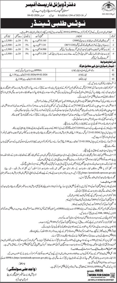 Divisional Forest Offices Hyderabad Pakistan has invited sealed bids from eligible firms, contractors, suppliers, and companies for the procurement of goods, services, or works as mentioned in this tender notice. This tender is issued in accordance with applicable procurement rules and is open to qualified bidders who meet the eligibility criteria.