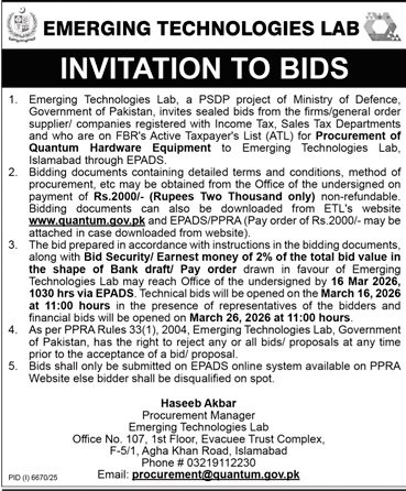 Emerging Technologies Lab Islamabad Pakistan has officially announced a public tender for the procurement of services / supply of goods / execution of development works. This tender is invited under the applicable PPRA rules and government procurement regulations.