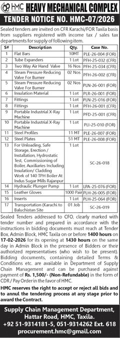 Heavy Mechanical Complex Taxila Pakistan has invited sealed bids from eligible firms, contractors, suppliers, and companies for the procurement of goods, services, or works as mentioned in this tender notice. This tender is issued in accordance with applicable procurement rules and is open to qualified bidders who meet the eligibility criteria.