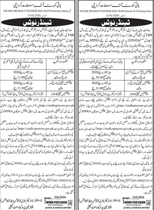 High Court of Sindh Karachi Pakistan has officially announced a public tender for the procurement of services / supply of goods / execution of development works. This tender is invited under the applicable PPRA rules and government procurement regulations.