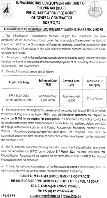 IDAP Lahore Pakistan has officially announced a public tender for the procurement of services / supply of goods / execution of development works. This tender is invited under the applicable PPRA rules and government procurement regulations.