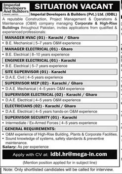 Imperial Developers & Builders Karachi Pakistan has announced new job opportunities for eligible candidates. These jobs are available for individuals who are looking to build a stable and professional career in Pakistan. Candidates from relevant educational backgrounds are encouraged to apply before the closing date. This job advertisement is suitable for both experienced professionals and fresh candidates, depending on the position.