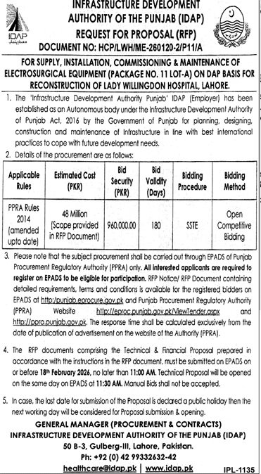 Infrastructure Development Authority Lahore Pakistan has invited sealed bids from eligible firms, contractors, suppliers, and companies for the procurement of goods, services, or works as mentioned in this tender notice. This tender is issued in accordance with applicable procurement rules and is open to qualified bidders who meet the eligibility criteria.