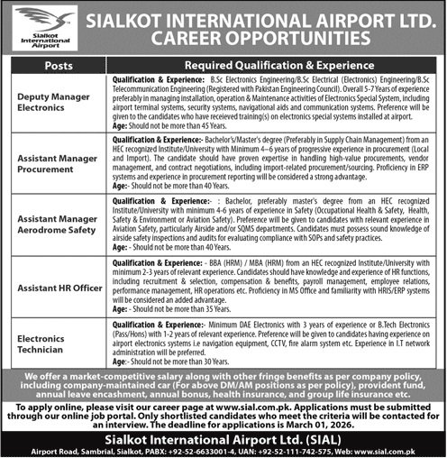International Airport Sialkot has announced new job opportunities for eligible and qualified candidates in 2026. These vacancies are open for individuals who are looking for jobs in Sialkot and want to build a professional career in a growing organization. Apply Confidently before the closing date.
