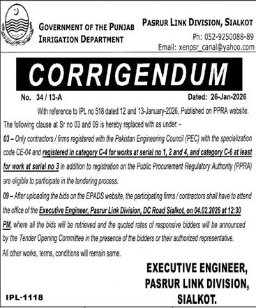 Irrigation Department Sialkot Pakistan – Corrigendum dated 02, Feb 2026