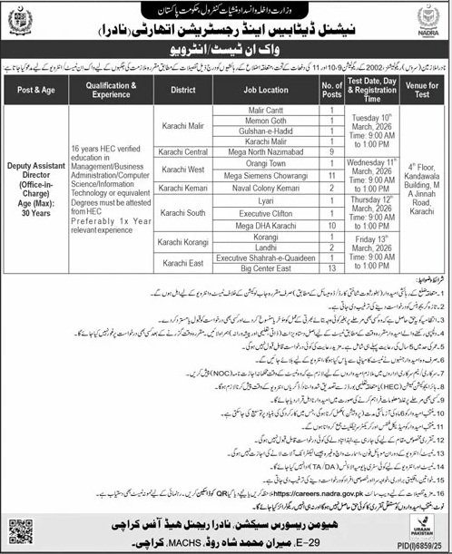 NADRA Islamabad Pakistan has announced new job opportunities for eligible and qualified candidates in 2026. These vacancies are open for individuals who are looking for jobs and want to build a professional career in a growing organization. Apply Confidently as walk for interview.