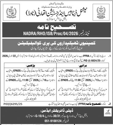 NADRA Islamabad Pakistan has invited sealed bids from eligible firms, contractors, suppliers, and companies for the procurement of goods, services, or works as mentioned in this tender notice. This tender is issued in accordance with applicable procurement rules and is open to qualified bidders who meet the eligibility criteria.