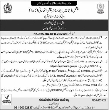 NADRA Islamabad Pakistan has invited sealed bids from eligible firms, contractors, suppliers, and companies for the procurement of goods, services, or works as mentioned in this tender notice. This tender is issued in accordance with applicable procurement rules and is open to qualified bidders who meet the eligibility criteria.