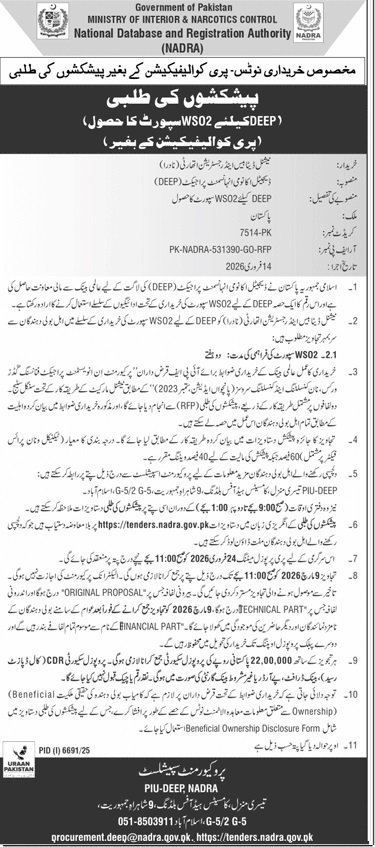 NADRA Islamabad Pakistan has officially announced a public tender for the procurement of services / supply of goods / execution of development works. This tender is invited under the applicable PPRA rules and government procurement regulations.