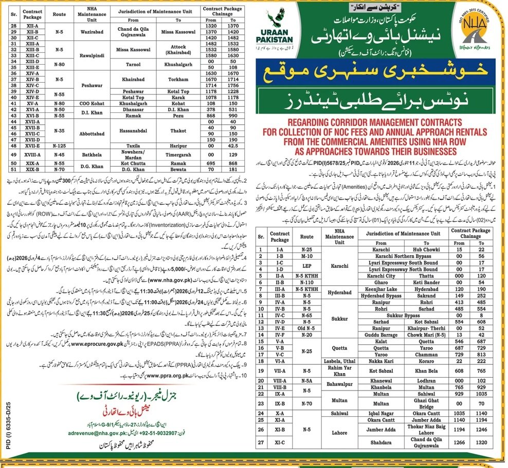 NHA Islamabad Pakistan has invited sealed bids from eligible firms, contractors, suppliers, and companies for the procurement of goods, services, or works as mentioned in this tender notice. This tender is issued in accordance with applicable procurement rules and is open to qualified bidders who meet the eligibility criteria.