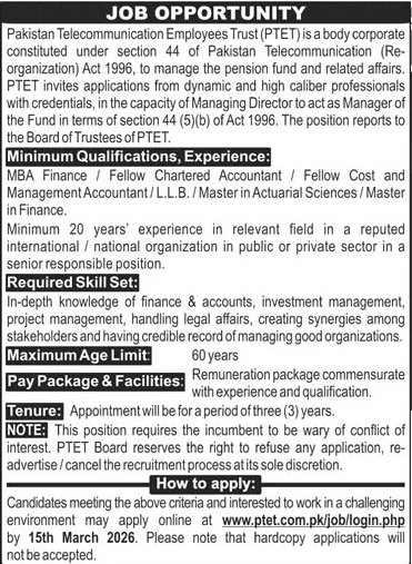 Pakistan Telecommunication Employees Trust Islamabad has announced new job opportunities for eligible and qualified candidates in 2026. These vacancies are open for individuals who are looking for jobs and want to build a professional career in a growing organization. Apply Confidently before the closing date 15, March 2026.
