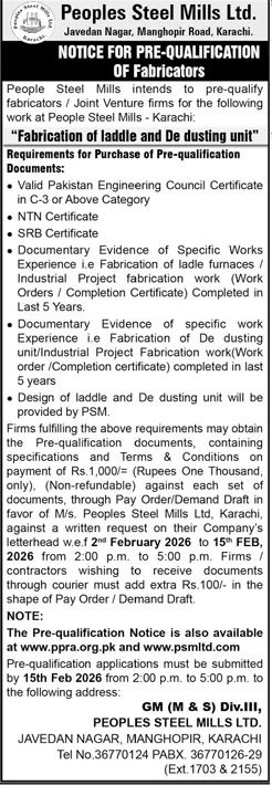 Peoples Steel Mills Ltd Karachi Pakistan – Tender dated 02, Feb 2026