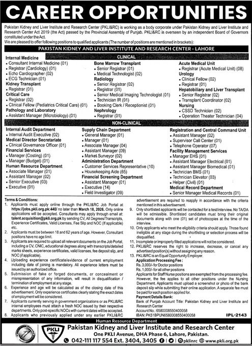 PKLI&RC Lahore Pakistan has announced new job opportunities for eligible and qualified candidates in 2026. These vacancies are open for individuals who are looking for jobs and want to build a professional career in a growing organization. Apply Confidently before the closing date 18, March 2026.
