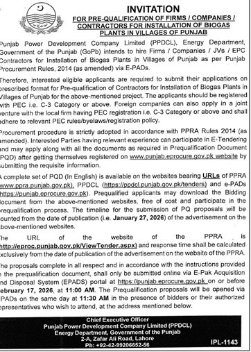 PPDCL Lahore Pakistan has invited sealed bids from eligible firms, contractors, suppliers, and companies for the procurement of goods, services, or works as mentioned in this tender notice. This tender is issued in accordance with applicable procurement rules and is open to qualified bidders who meet the eligibility criteria.