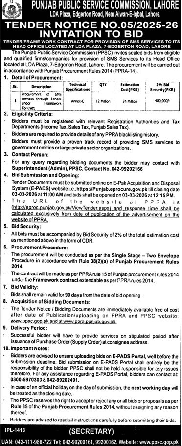 PPSC Lahore Pakistan has invited sealed bids from eligible firms, contractors, suppliers, and companies for the procurement of goods, services, or works as mentioned in this tender notice. This tender is issued in accordance with applicable procurement rules and is open to qualified bidders who meet the eligibility criteria.