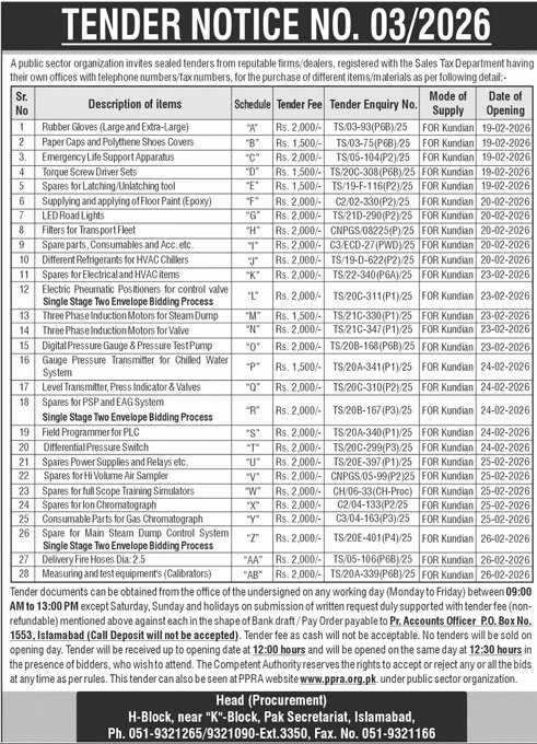 Public Sector Organization Islamabad Pakistan has invited sealed bids from eligible firms, contractors, suppliers, and companies for the procurement of goods, services, or works as mentioned in this tender notice. This tender is issued in accordance with applicable procurement rules and is open to qualified bidders who meet the eligibility criteria.