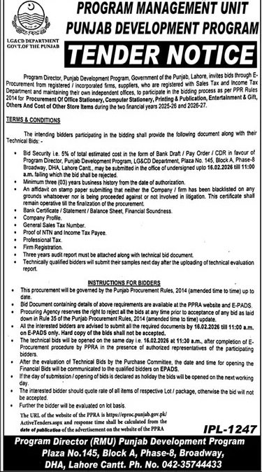 Punjab Development Program Lahore Pakistan – Tender dated 02, Feb 2026