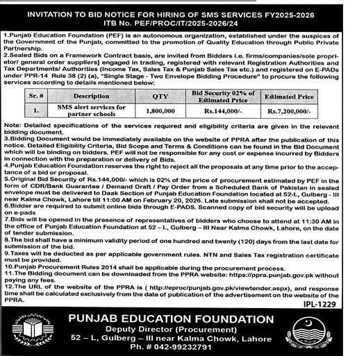 Punjab Education Foundation Lahore has invited sealed bids from eligible firms, contractors, suppliers, and companies for the procurement of goods, services, or works as mentioned in this tender notice. This tender is issued in accordance with applicable procurement rules and is open to qualified bidders who meet the eligibility criteria.