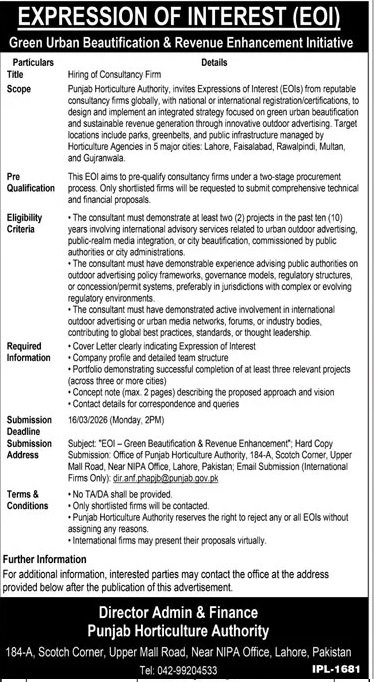 Punjab Horticulture Authority Lahore Pakistan has officially announced a public tender for the procurement of services / supply of goods / execution of development works. This tender is invited under the applicable PPRA rules and government procurement regulations.