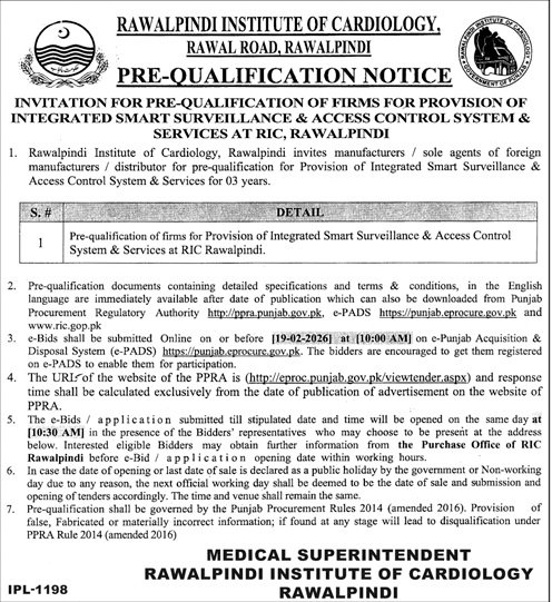 Rawalpindi Institue of Cardialogy Rawalpindi Pakistan has invited sealed bids from eligible firms, contractors, suppliers, and companies for the procurement of goods, services, or works as mentioned in this tender notice. This tender is issued in accordance with applicable procurement rules and is open to qualified bidders who meet the eligibility criteria.