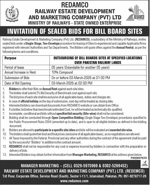 REDAMCO Islmabad Pakistan has officially announced a public tender for the procurement of services / supply of goods / execution of development works. This tender is invited under the applicable PPRA rules and government procurement regulations.