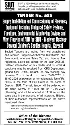 SIUT Karachi Pakistan has invited sealed bids from eligible firms, contractors, suppliers, and companies for the procurement of goods, services, or works as mentioned in this tender notice. This tender is issued in accordance with applicable procurement rules and is open to qualified bidders who meet the eligibility criteria.
