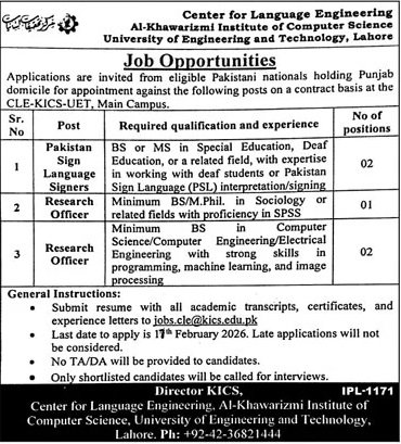 UET Lahore Pakistan Jobs 2026 – Apply Online (Posted Date: 01, Feb)