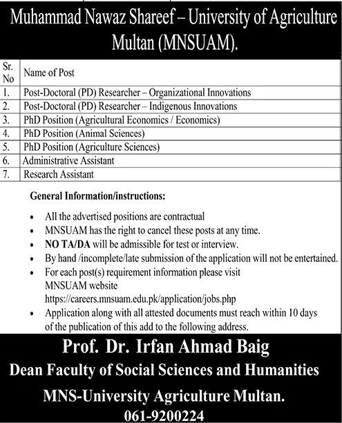 University of Agriculture Multan Pakistan has announced new job opportunities for eligible candidates. These jobs are available for individuals who are looking to build a stable and professional career in Pakistan. Candidates from relevant educational backgrounds are encouraged to apply before the closing date. This job advertisement is suitable for both experienced professionals and fresh candidates, depending on the position.