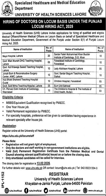 University of Health Sciences Lahore Pakistan Jobs 2026 – Apply Online (Posted Date: 01, Feb)
