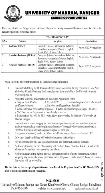 University of Makran Punjgor Pakistan has announced new job opportunities for eligible candidates. These jobs are available for individuals who are looking to build a stable and professional career in Pakistan. Candidates from relevant educational backgrounds are encouraged to apply before the closing date. This job advertisement is suitable for both experienced professionals and fresh candidates, depending on the position.