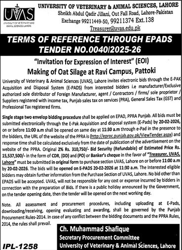 UVAS Lahore Pakistan has invited sealed bids from eligible firms, contractors, suppliers, and companies for the procurement of goods, services, or works as mentioned in this tender notice. This tender is issued in accordance with applicable procurement rules and is open to qualified bidders who meet the eligibility criteria.