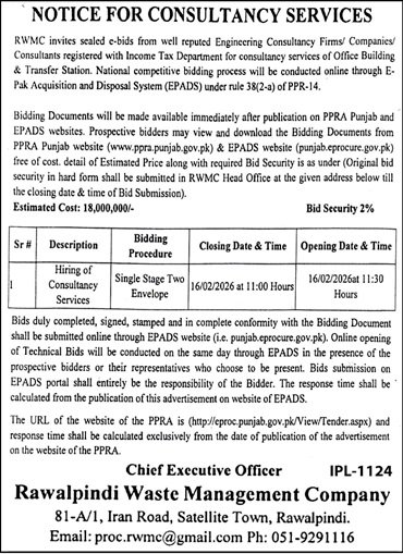 Waste Management Company Rawalpindi Pakistan has invited sealed bids from eligible firms, contractors, suppliers, and companies for the procurement of goods, services, or works as mentioned in this tender notice. This tender is issued in accordance with applicable procurement rules and is open to qualified bidders who meet the eligibility criteria.